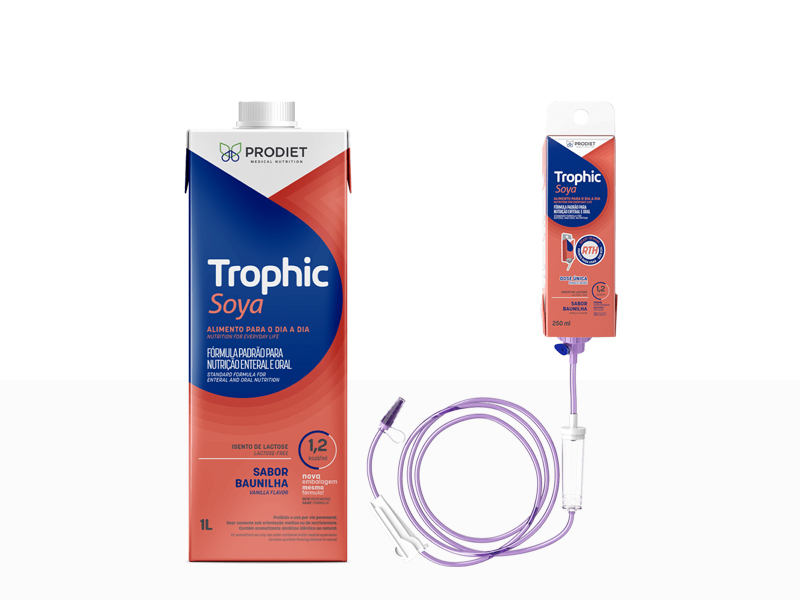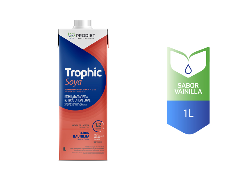 Trophic Soya es una fórmula nutricional normocalórica, diseñada para pacientes en nutrición enteral prolongada o con riesgo nutricional. Proporciona 1.2 kcal/ml y está compuesta exclusivamente por proteína aislada de soja, una fuente vegetal de alto valor biológico que contribuye al mantenimiento de la masa muscular y al buen funcionamiento del organismo.